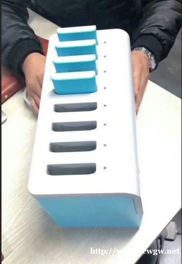 机柜:主要咻电电采用6口式;卡槽向上的立体柜机,外观像烤面包机一样,也称面包机;机柜大小参数值:长20cm——宽13.2cm——高13.3cm,机身小巧不占位置,外壳以白色围绕,底部和充电宝颜色多样化;增加整体的视觉效果。机柜外壳有专门的实验室进行检测合格完成,主要采用高温,Abs,防火,抗摔等材质;机柜表面可设广告展示,产品流程,产品IOGO,二维码,联系方式等内容展示;顶部设有蓝色的灯光作为提示感应灯;每个卡槽都具有充电功能,充电宝放入即刻快速充电。
